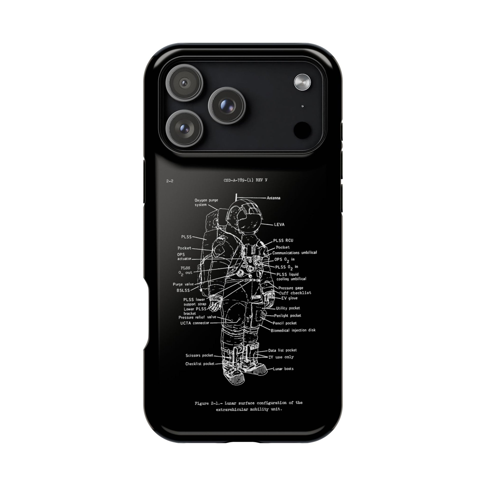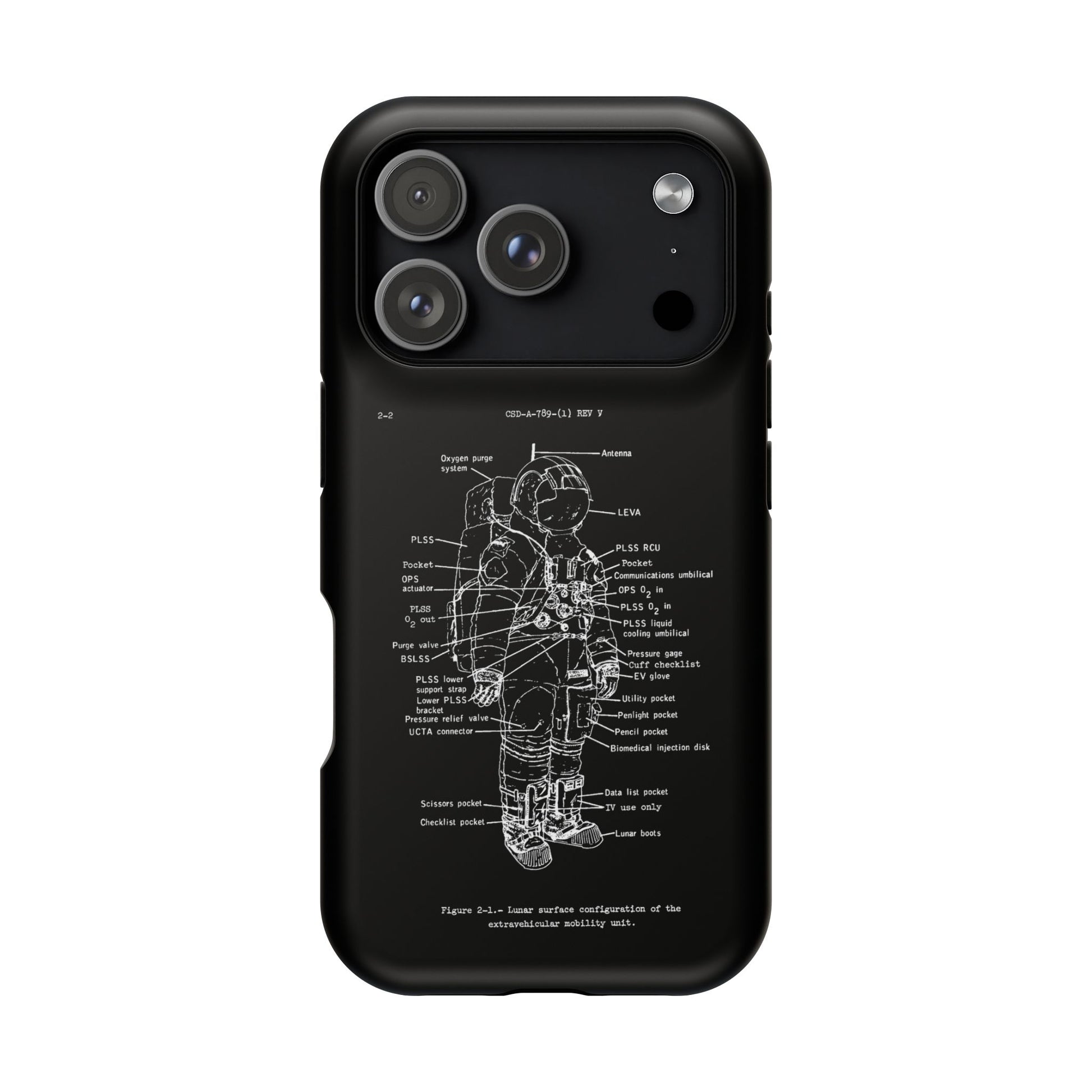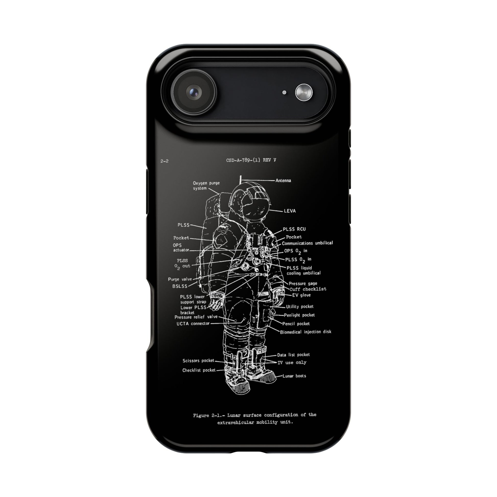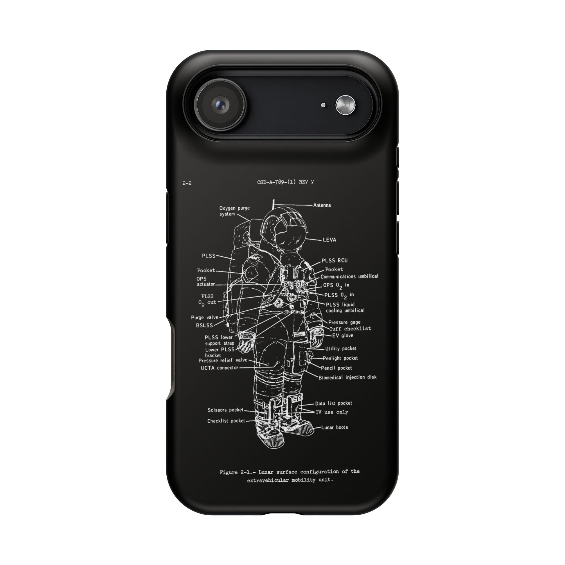 This phone case features a detailed and authentic diagram of the Extravehicular Mobility Unit (EMU) from the Apollo Operations Handbook, Volume I, 5th revision. It's the design of the spacesuit for Apollo 15-17 (Apollo J) astronauts for their missions on the Moon's surface.
