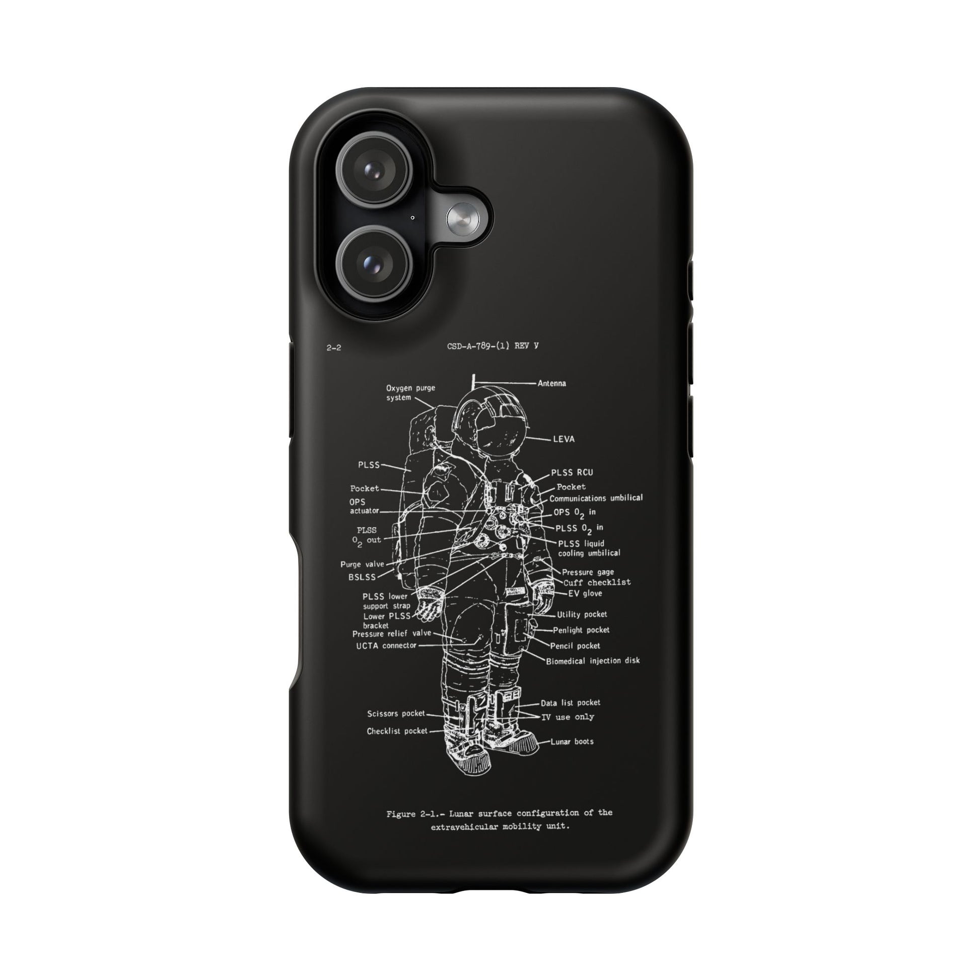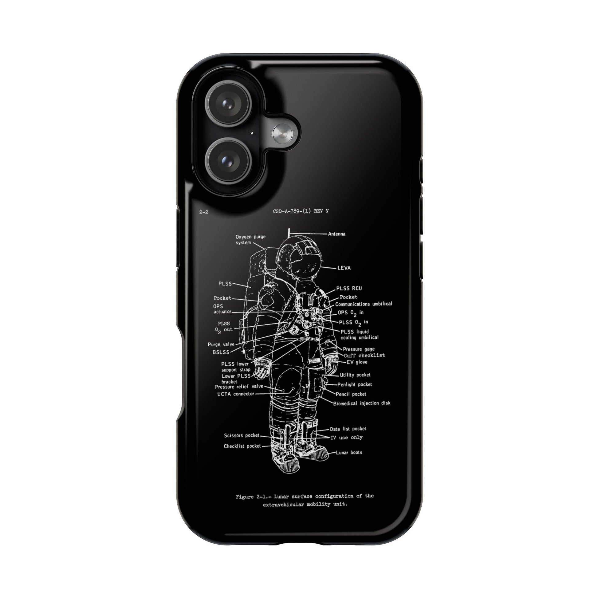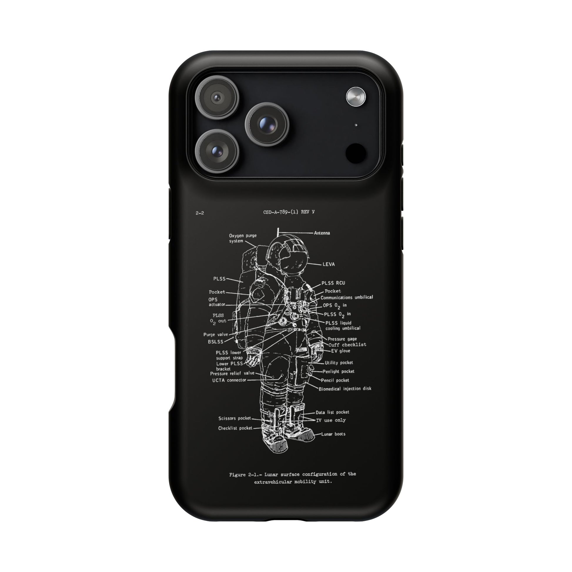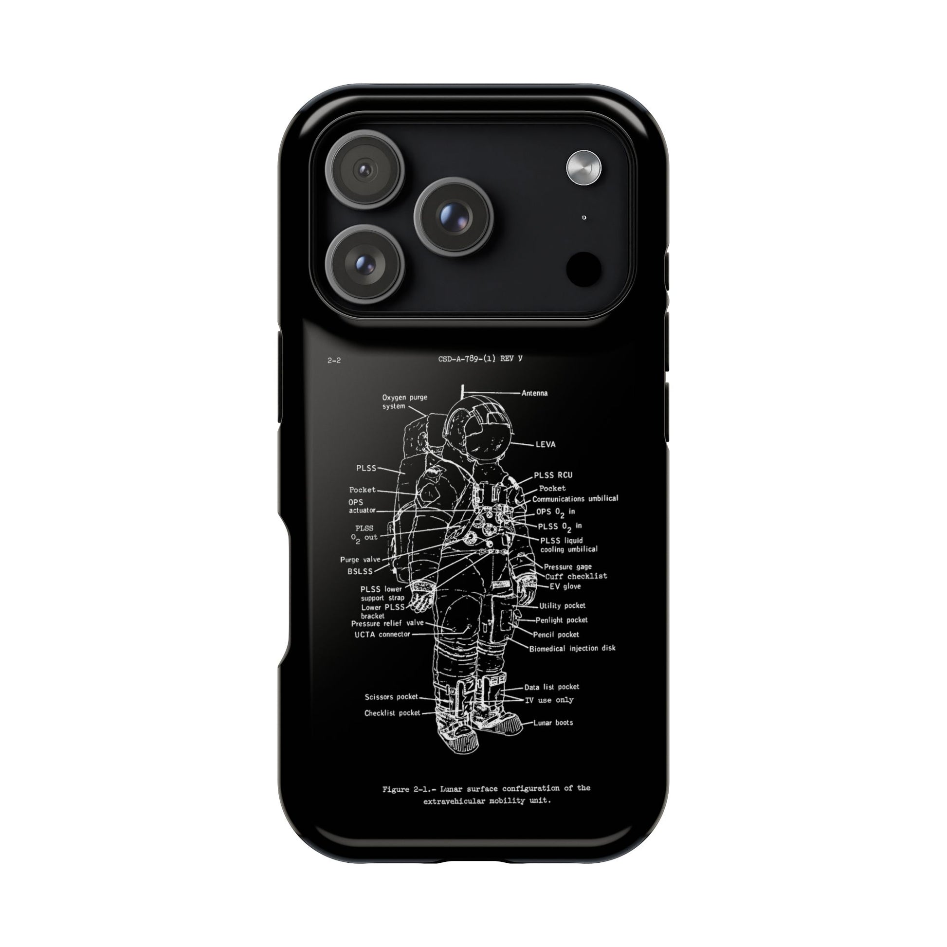 This phone case features a detailed and authentic diagram of the Extravehicular Mobility Unit (EMU) from the Apollo Operations Handbook, Volume I, 5th revision. It's the design of the spacesuit for Apollo 15-17 (Apollo J) astronauts for their missions on the Moon's surface.